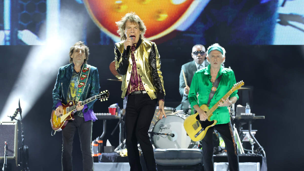photo of Mick JaggerKeith Richards and Ronnie Wood is captioned with, "When you think the party’s over but it’s only just begun...” which is a lyric from "Whole Wide World" off their last album, 2023's Hackney Diamonds, followed by "Still Rolling."